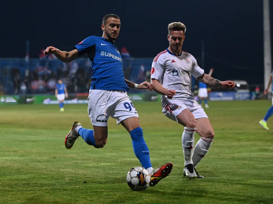 Damien Dylan Dussaut si Alexandru Mihai Constantin Pop în meciul de fotbal dintre Farul Constanta si Otelul Galati, contând pentru Superliga Superbet, desfășurat pe Stadionul central al Academiei Gheorghe Hagi din Ovidiu, sambata 24 februarie 2024. © FOTO: Răzvan PĂSĂRICĂ/SPORT PICTURES