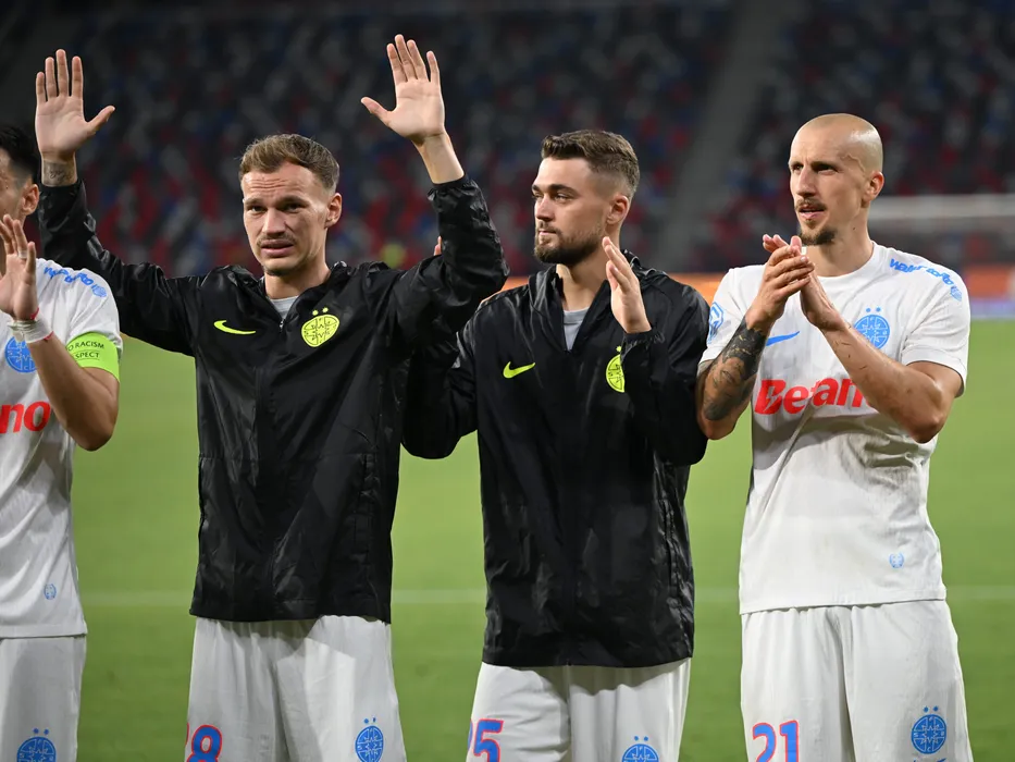 Fotbaliștii ros-albastrii Grigoraș Alexandru Pantea, Ovidiu Perianu si Vlad Iulian Chiricheș saluta galeria dupa meciul de fotbal dintre FCSB si Inter Club D'Escaldes, contand pentru Preliminariile Ligii Campionilor, desfasurat pe Stadionul Steaua din Bucuresti, miercuri 9 iulie 2025. © FOTO:Razvan Pasarica/SPORT PICTURES