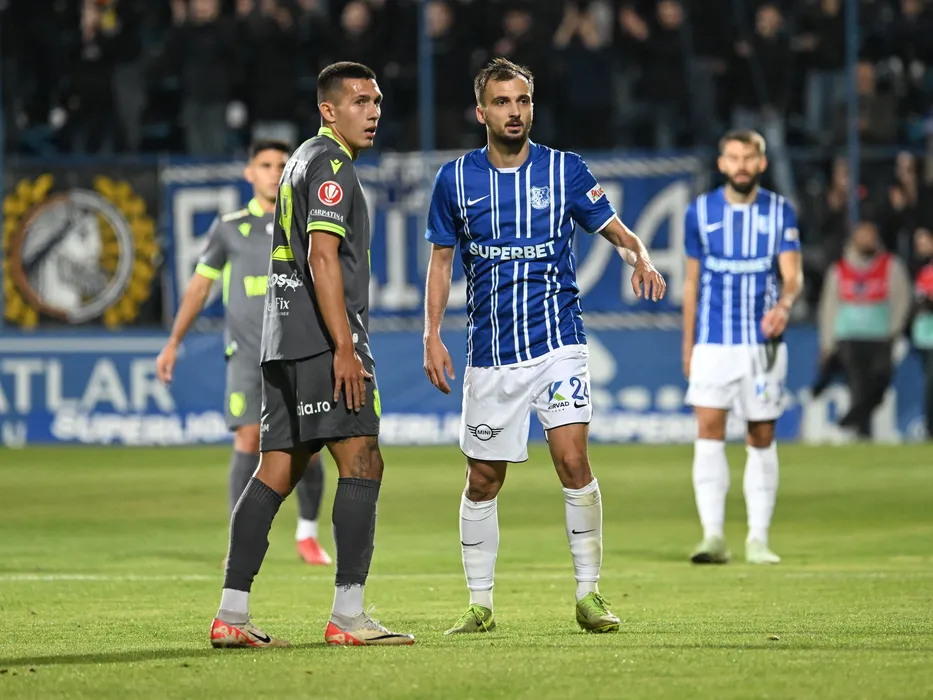 Robert Marian Moldoveanu si Boban Nikolov in meciul de fotbal dintre Farul Constanta si FC Arges, contand pentru Superliga Superbet, desfasurat pe Stadionul central al Academiei Gheorghe Hagi din Ovidiu, vineri 17 octombrie 2025. © FOTO:Razvan Pasarica/SPORT PICTURES