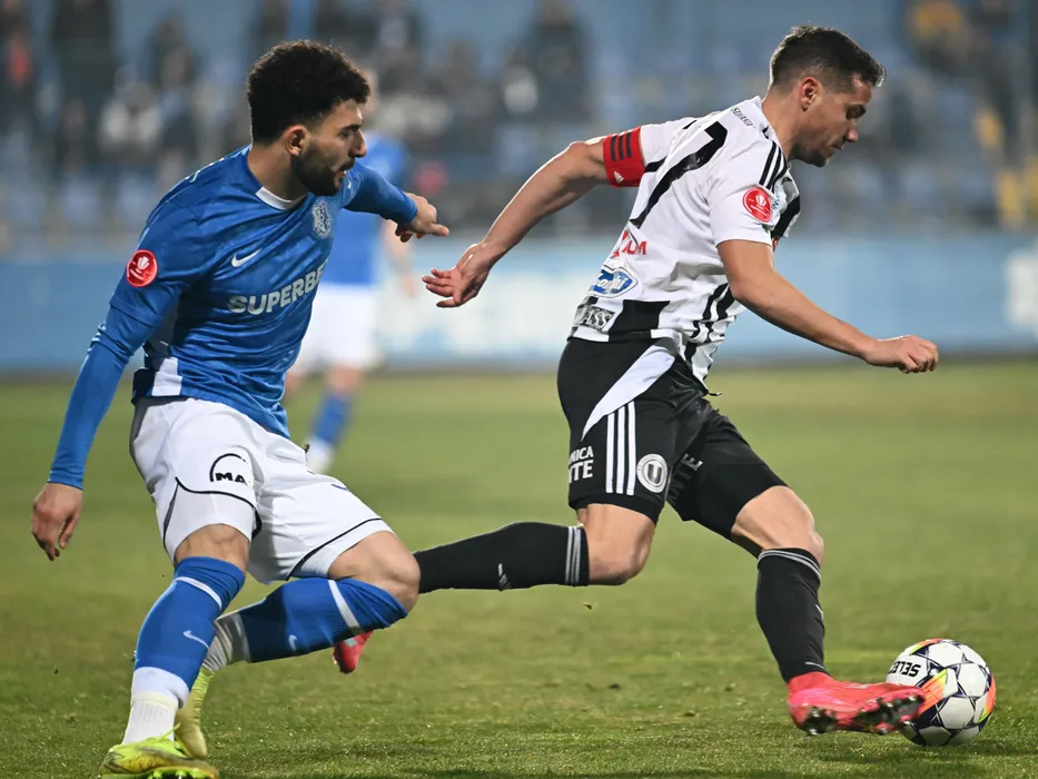 Narek Grigoryan si Mihaita Alexandru Chipciu in meciul de fotbal dintre Farul Constanta si Universitatea Cluj, contand pentru Superliga Superbet, desfasurat pe Stadionul central al Academiei Gheorghe Hagi din Ovidiu, vineri 7 martie 2025. © FOTO:Razvan Pasarica/SPORT PICTURES