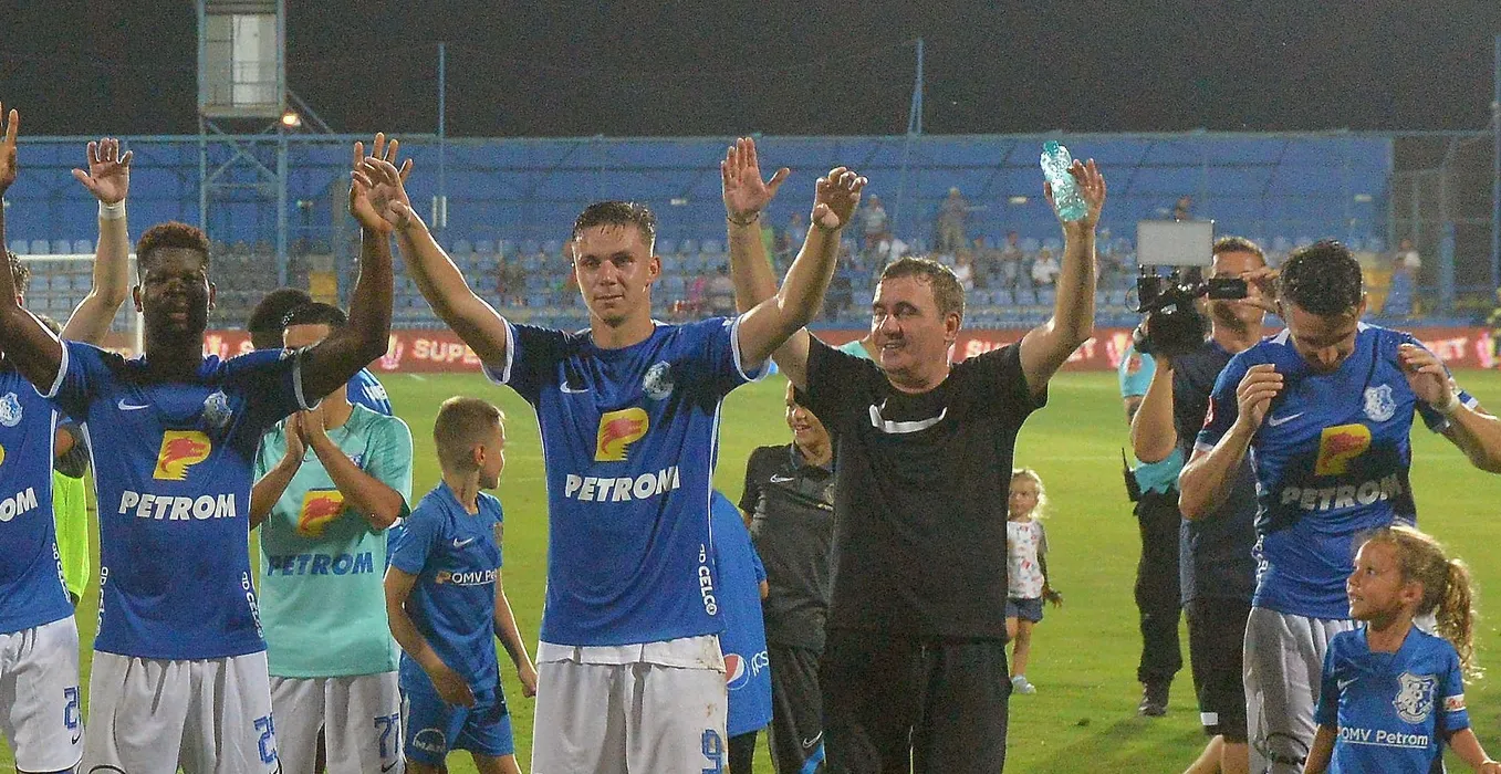 Fotbalistii constanteni Tudor Cristian Baluta, Sebastian Andrei Borza, Alexi Paul Pitu, Denis Alibec, Adrian Mazilu, Louis Munteanu alaturi de Gheorghe Hagi saluta galeria dupa meciul de fotbal dintre Farul Constanta si FC Voluntari, contand pentru Superliga Superbet, desfasurat pe Stadionul central al Academiei Gheorghe Hagi din Ovidiu, luni 22 august 2022. © FOTO:Razvan Pasarica/SPORT PICTURES