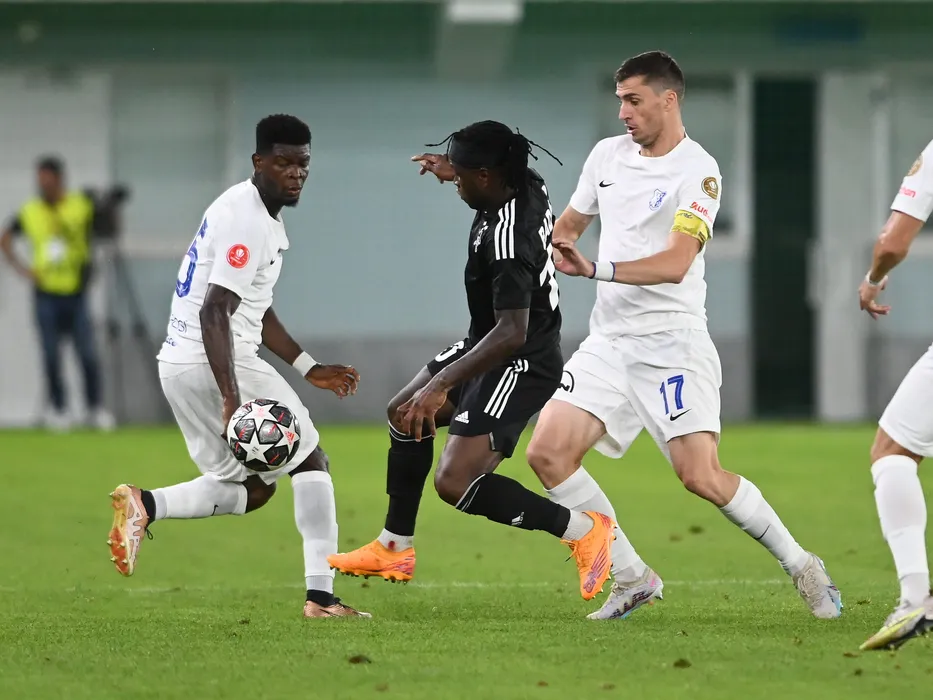 /David Kiki, Cedric Badolo si Ionut Justinian Larie in meciul de fotbal dintre FC Sferiff Tiraspol si FCV Farul Constanta, din cadrul Preliminariilor Ligii Campionilor, desfasurat pe Stadionul Sheriff din Tiraspol, marti 18 iulie 2023. © FOTO:Razvan Pasarica/SPORT PICTURES