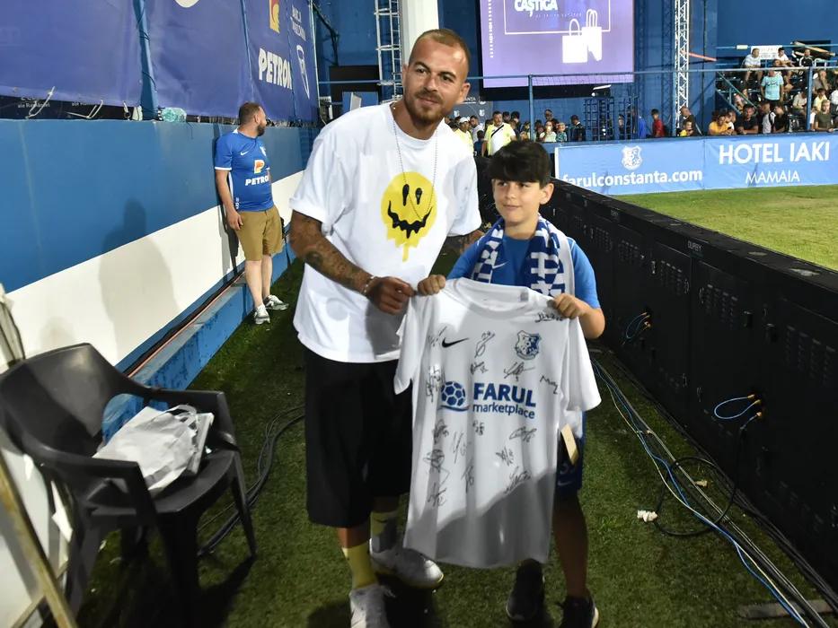 Denis Alibec pozeaza alaturi de un tanar suporter constantean in pauza meciului de fotbal dintre Farul Constanta si Chindia Targoviste, contand pentru Superliga Superbet, desfasurat pe Stadionul central al Academiei Gheorghe Hagi din Ovidiu, vineri 29 iulie 2022. © FOTO:Razvan Pasarica/SPORT PICTURES