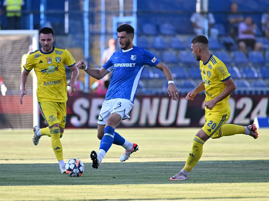 Florin Flavius Purece, Mihai Popescu si Ovidiu Ioan Perianu in meciul de fotbal dintre Farul Constanta si Unirea Slobozia, contand pentru Superliga Superbet, desfasurat pe Stadionul central al Academiei Gheorghe Hagi din Ovidiu, vineri 12 iulie 2024. © FOTO:Razvan Pasarica/SPORT PICTURES