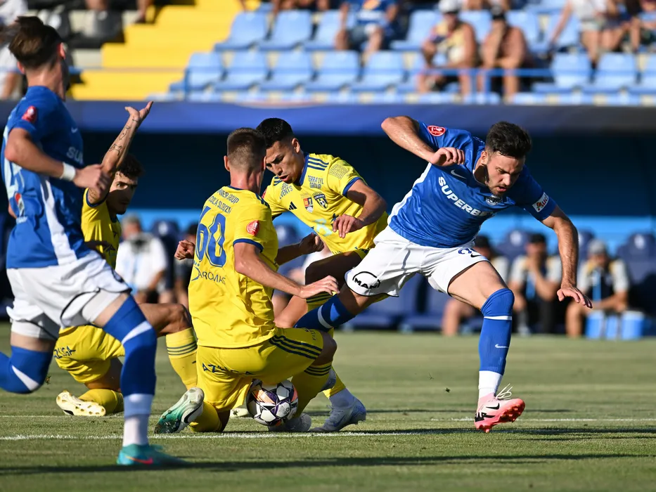 Etienne Paolo Medina si Dan Sîrbu in meciul de fotbal dintre Farul Constanta si Unirea Slobozia, contand pentru Superliga Superbet, desfasurat pe Stadionul central al Academiei Gheorghe Hagi din Ovidiu, vineri 12 iulie 2024. © FOTO:Razvan Pasarica/SPORT PICTURES