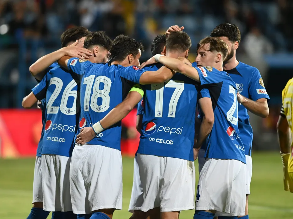 Bucurie a fotbalistilor constanteni dupa un gol marcatcu Andrei Viorel Artean si Constantin Grameni in meciul de fotbal dintre Farul Constanta si Sepsi OSK Sfantu Gheorghe, contand pentru Superliga Superbet, desfasurat pe Stadionul central al Academiei Gheorghe Hagi din Ovidiu, sambata 30 septembrie 2023. © FOTO:Razvan Pasarica/SPORT PICTURES