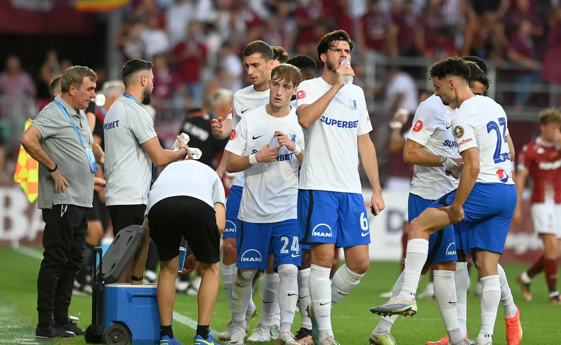 Gheorghe Hagi alaturi de fotbalistii constanteni Constantin Grameni, Ionut Justinian Larie, Tudor Cristian Baluta si Nicolae Carnat la o pauza de hidratare luata in meciul de fotbal dintre Rapid Bucuresti si Farul Constanta, din cadrul Superligii Superbet, desfasurat pe Superbet Arena-Giulesti din Bucuresti, duminica 20 august 2023. © FOTO:Razvan Pasarica/SPORT PICTURES