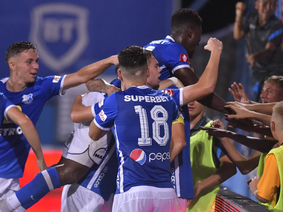 Bucurie a fotbalistilor constanteni dupa un gol marcat cu Louis Munteanu, Sebastian Andrei Borza si Enagnon David Kiki in meciul de fotbal dintre Farul Constanta si FC Voluntari, contand pentru Superliga Superbet, desfasurat pe Stadionul central al Academiei Gheorghe Hagi din Ovidiu, luni 22 august 2022. © FOTO:Razvan Pasarica/SPORT PICTURES