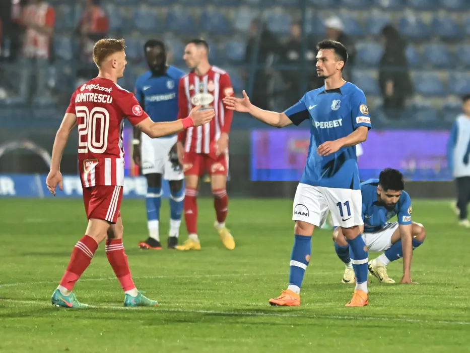 Andres Mihai Dumitrescu il saluta pe Cristian George Ganea dupa meciul de fotbal dintre Farul Constanta si Sepsi OSK Sfantu Gheorghe, contand pentru Play off-ul Superligii Superbet, desfasurat pe Stadionul central al Academiei Gheorghe Hagi din Ovidiu, vineri 3 mai 2024. © FOTO:Razvan Pasarica/SPORT PICTURES