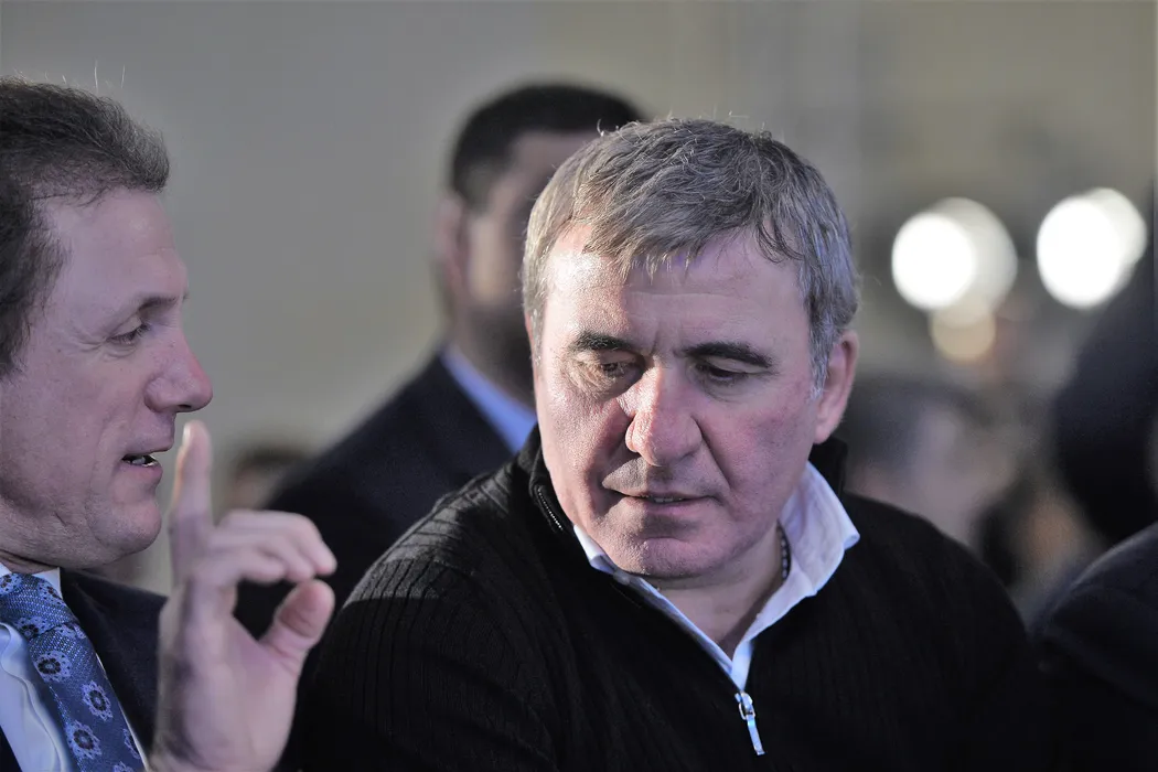Gica Popescu (S) si Gheorghe Hagi (D) participa la o conferinta de presa sustinuta de Ionut Lupescu (nu este in imagine) care isi lanseaza oficial candidatura la presedintia Federatiei Romane de Fotbal (FRF), luni, 26 februarie 2018, in Bucuresti. ALEXANDRU DOBRE / MEDIAFAX FOTO