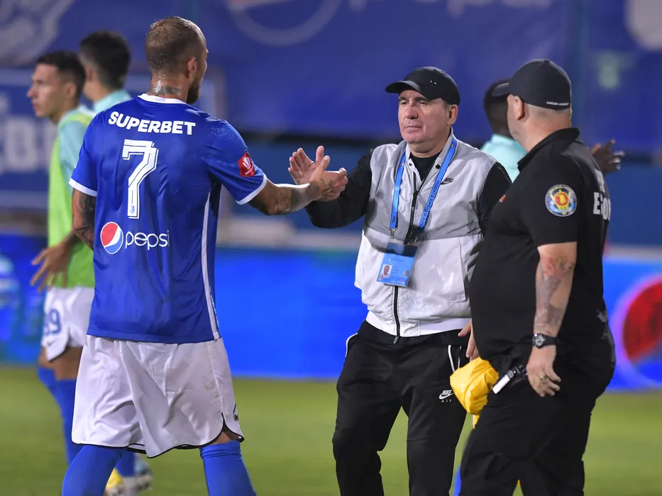 Gheorghe Hagi il incurajeaza pe Denis Alibec dupa meciul de fotbal dintre Farul Constanta si FC Hermannstadt, contand pentru Superliga Superbet, desfasurat pe Stadionul central al Academiei Gheorghe Hagi din Ovidiu, luni 15 august 2022. © FOTO:Razvan Pasarica/SPORT PICTURES