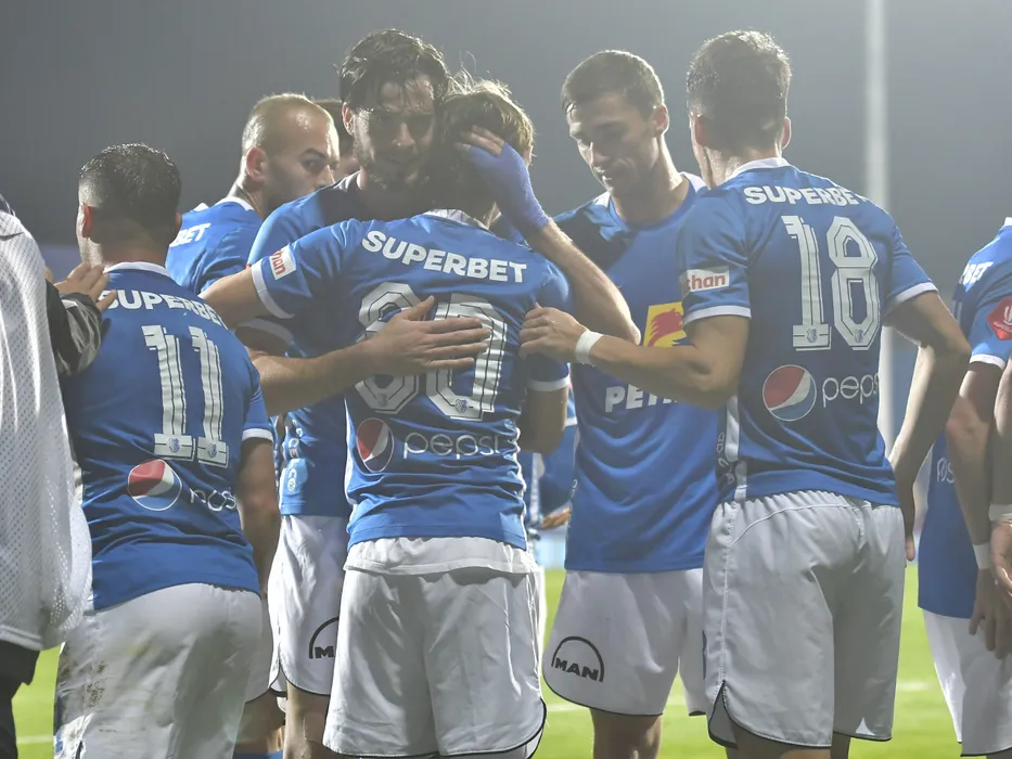 Tudor Cristian Baluta si Ionut Justinian Larie il felicita pe Alexi Paul Pitu dupa un gol marcat in meciul de fotbal dintre Farul Constanta si CS Mioveni, contand pentru Superliga Superbet, desfasurat pe Stadionul central al Academiei Gheorghe Hagi din Ovidiu, vineri 4 noiembrie 2022. © FOTO:Razvan Pasarica/SPORT PICTURES
