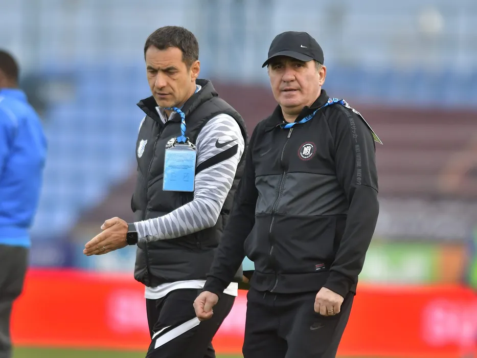 Catalin Cristian Anghel si Gheorghe Hagi discuta la pauza meciului de fotbal dintre FC Voluntari si Farul Constanta, contand pentru Play-off-ul Ligii 1 Casa Pariurilor, desfasurat pe Stadionul Anghel Iordanescu din Voluntari, sambata 2 aprilie 2022. © FOTO:Razvan Pasarica/SPORT PICTURES