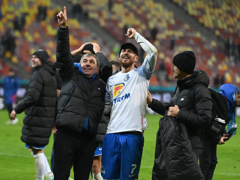 Gheorghe Hagi il felicita pe Denis Alibec dupa meciul de fotbal dintre FCSB si Farul Constanta, contand pentru Superliga Superbet, desfasurat pe Arena Nationala din Bucuresti, duminica 29 ianuarie 2023. © FOTO:Razvan Pasarica/SPORT PICTURES