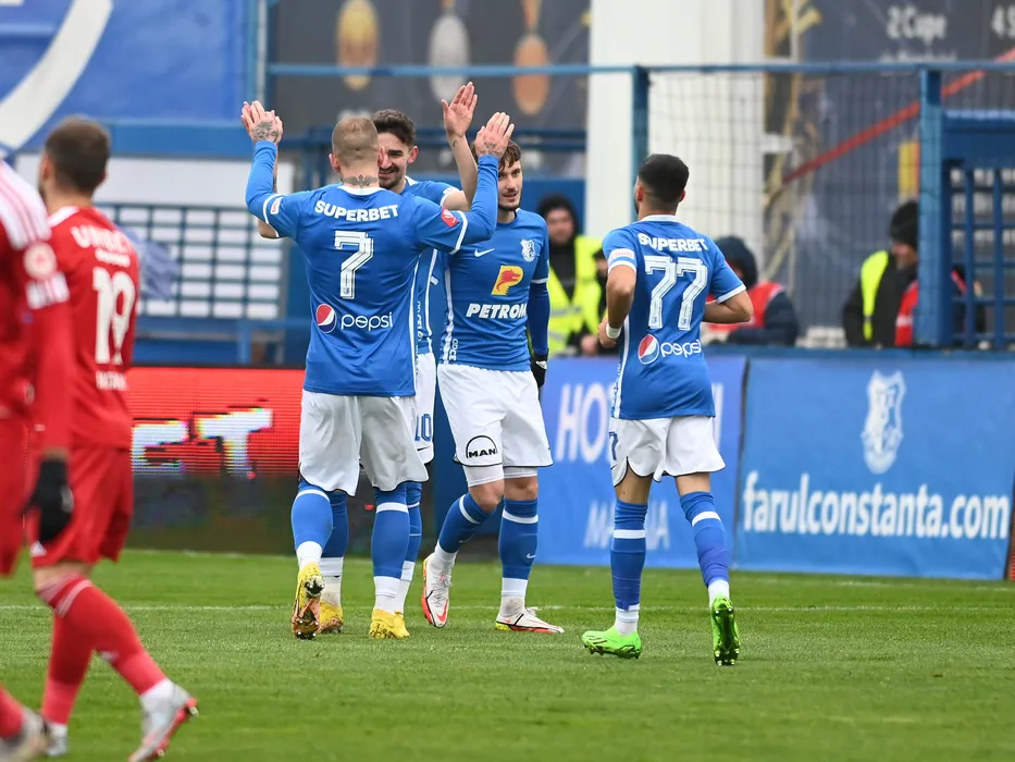 Vladut Calin Morar se bucura dupa un gol marcat alaturi de Denis Alibec si Roberto Carlo Casap in meciul de fotbal dintre Farul Constanta si FC Botosani, contand pentru Superliga Superbet, desfasurat pe Stadionul central al Academiei Gheorghe Hagi din Ovidiu, duminica 4 decembrie 2022. © FOTO:Razvan Pasarica/SPORT PICTURES