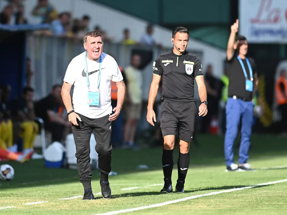 Gheorghe Hagi reactioneaza alaturi de arbitrul de rezerva Cristian Moldoveanu in meciul de fotbal dintre Petrolul Ploiesti si Farul Constanta, din cadrul Superligii Superbet, desfasurat pe Stadionul Ilie Oana din Ploiesti, duminica 6 august 2023. © FOTO:Razvan Pasarica/SPORT PICTURES