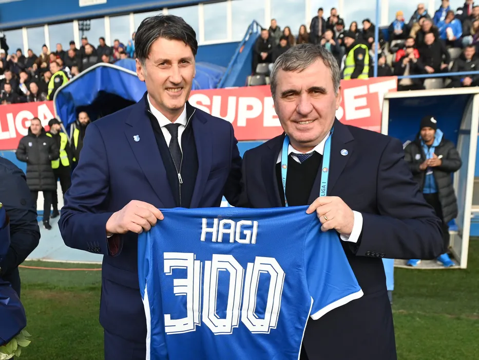 Zoltan Iasko ii ofera lui Gheorghe Hagi un tricou cu numarul 300 inscriptionat cu ocazia celor tot atatea prezente pe banca Ligii 1 in startul meciului de fotbal dintre Farul Constanta si Sepsi OSK Sfantu Gheorghe, contand pentru Play-off-ul Superligii Superbet, desfasurat pe Stadionul central al Academiei Gheorghe Hagi din Ovidiu, duminica 19 martie 2023. © FOTO:Razvan Pasarica/SPORT PICTURES