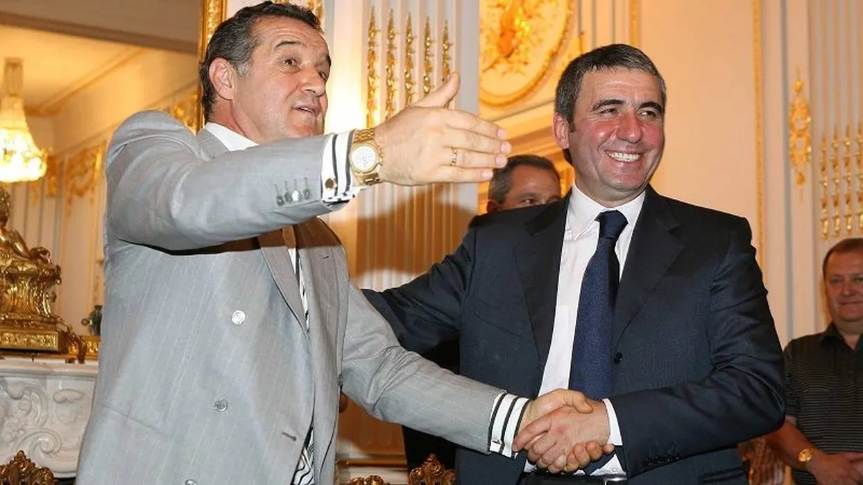 Tehnicianul Gheorghe Hagi (S) si finantatorul Gigi Becali (D) dau mana, la finalul unei conferinte de presa, in Bucuresti, luni, 25 iunie 2007. Gheorghe Hagi a fost prezentat oficial in functia de antrenor al echipei Steaua, finantatorul Gigi Becali anuntand ca fostul selectioner a semnat un contract pe trei sezoane. GEORGE FILIP / MEDIAFAX FOTO