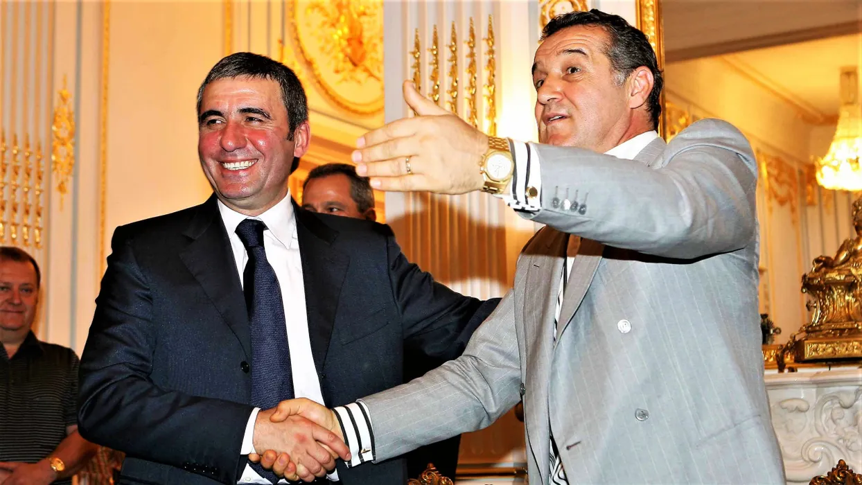 Tehnicianul Gheorghe Hagi (S) si finantatorul Gigi Becali (D) dau mana, la finalul unei conferinte de presa, in Bucuresti, luni, 25 iunie 2007. Gheorghe Hagi a fost prezentat oficial in functia de antrenor al echipei Steaua, finantatorul Gigi Becali anuntand ca fostul selectioner a semnat un contract pe trei sezoane. GEORGE FILIP / MEDIAFAX FOTO