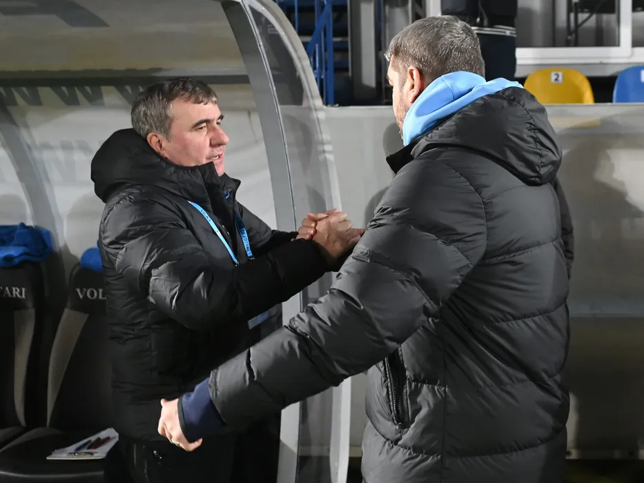 Cei doi antrenori Gheorghe Hagi si Liviu Ciobotariu se saluta inaintea meciului de fotbal dintre FC Voluntari si Farul Constanta, contand pentru Superliga Superbet, desfasurat pe Stadionul Anghel Iordanescu din Voluntari, vineri 16 decembrie 2022. © FOTO:Razvan Pasarica/SPORT PICTURES