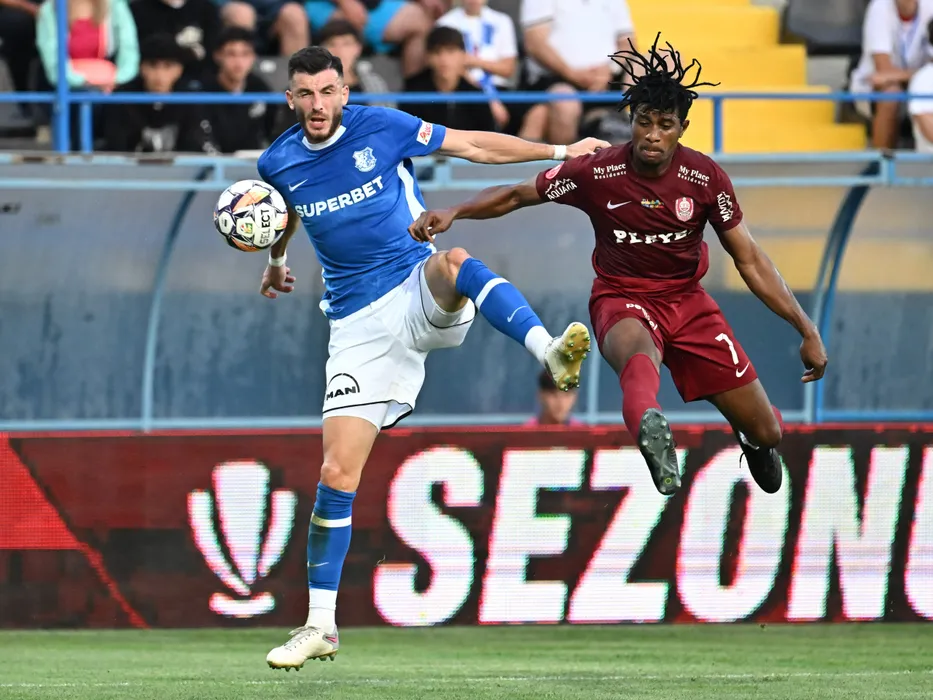 Mihai Popescu si Mohammed Kesselly Kamara in meciul de fotbal dintre Farul Constanta si CFR Cluj, contand pentru Superliga Superbet, desfasurat pe Stadionul central al Academiei Gheorghe Hagi din Ovidiu, duminica 1 septembrie 2024. © FOTO:Razvan Pasarica/SPORT PICTURES