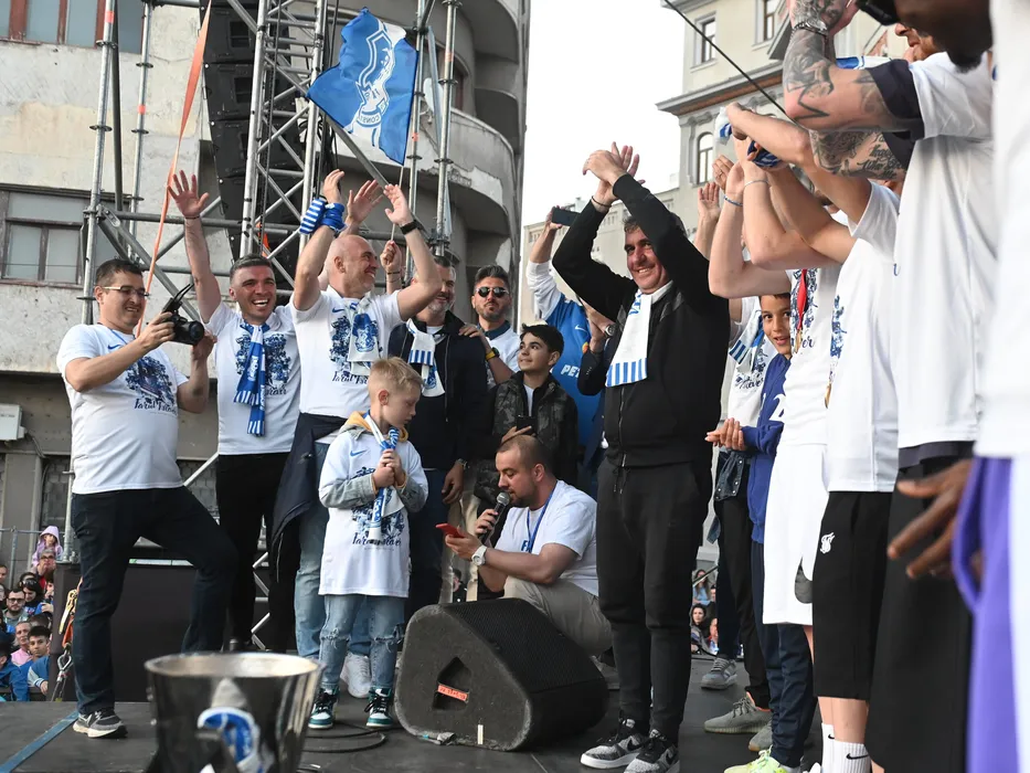 Fotbalistii Farului alaturi de Gheorghe Hagi se bucura alaturi de suporteri in Piata Ovidiu din Constanta, cu ocazia prezentarii trofeului, luni 22 mai 2023. © FOTO:Razvan Pasarica/SPORT PICTURES