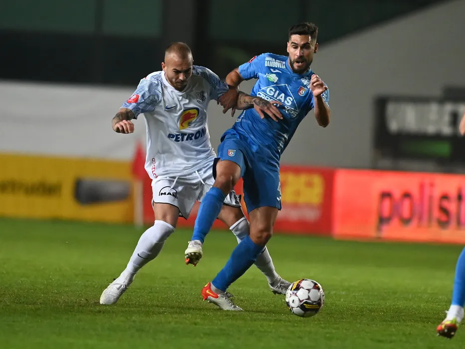 Denis Alibec si Juan Pablo Passaglia in meciul de fotbal dintre Chindia Targoviste si Farul Constanta, contand pentru Superliga Superbet, desfasurat pe Stadionul Ilie Oana din Ploiesti, sambata 12 noiembrie 2022. © FOTO:Razvan Pasarica/SPORT PICTURES