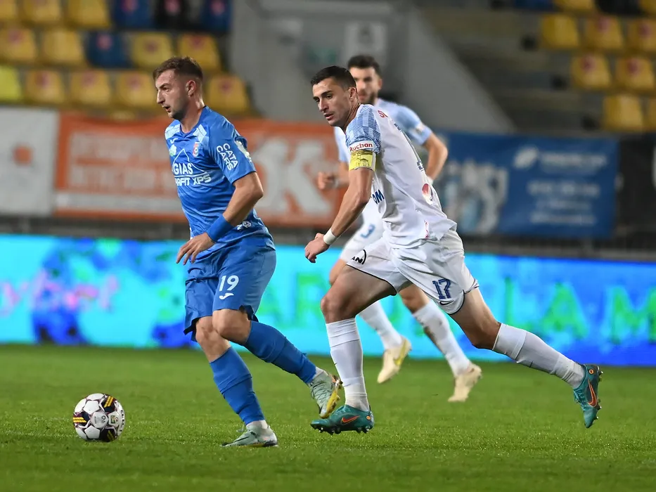 Iliuta Daniel Popa si Ionut Justinian Larie in meciul de fotbal dintre Chindia Targoviste si Farul Constanta, contand pentru Superliga Superbet, desfasurat pe Stadionul Ilie Oana din Ploiesti, sambata 12 noiembrie 2022. © FOTO:Razvan Pasarica/SPORT PICTURES