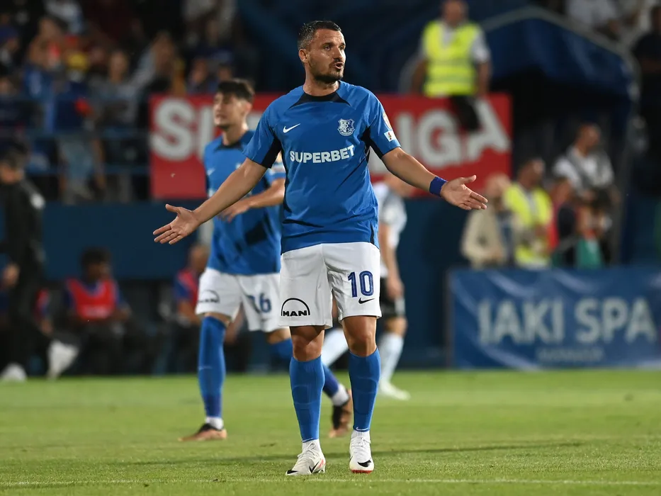 Constantin Valentin Budescu reactioneaza in meciul de fotbal dintre Farul Constanta si Flora Tallinn, contand pentru UEFA Europa Conference League, desfasurat pe Stadionul central al Academiei Gheorghe Hagi din Ovidiu, joi 10 august 2023. © FOTO:Razvan Pasarica/SPORT PICTURES