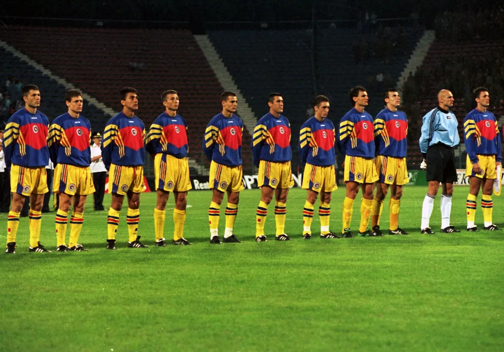 Fotbalistii Romaniei la inceputul partidei, de la dreapta la stanga:Gica Popescu,Bogdan Stelea,Daniel Prodan,Toni Dobos,Denis Serban,Viorel Moldovan,Costel Galca,Dan Petrescu,Ilie Dumitrescu,Tibor Selymes si Adrian Ilie