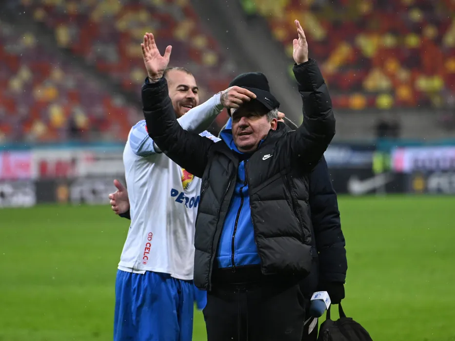 Denis Alibec ii returneaza sapca lui Gheorghe Hagi dupa meciul de fotbal dintre FCSB si Farul Constanta, contand pentru Superliga Superbet, desfasurat pe Arena Nationala din Bucuresti, duminica 29 ianuarie 2023. © FOTO:Razvan Pasarica/SPORT PICTURES