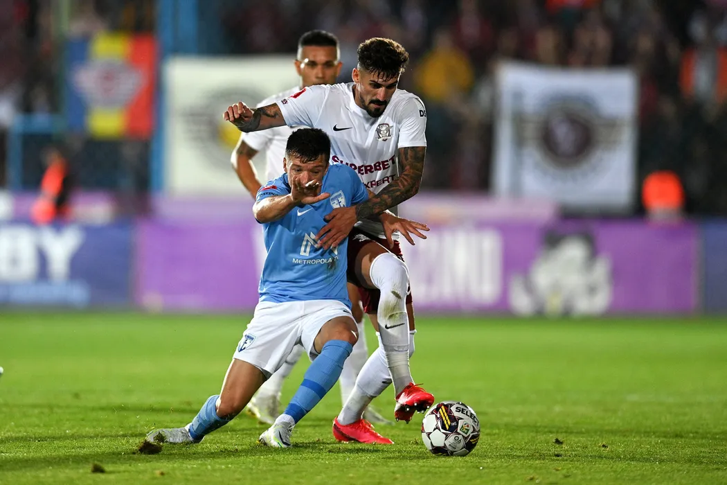 Vadim Rata (S), de la FC Voluntari, lupta pentru balon cu Cristian Albu (D), de la Rapid, in meciul de fotbal din etapa a IX-a a Superligii, disputat pe stadionul Anghel Iordanescu din Voluntari, sambata, 3 septembrie 2022. EDUARD VINATORU/ MEDIAFAX FOTO