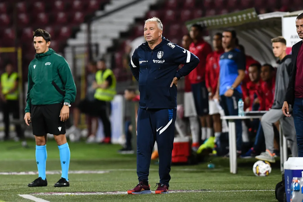 Dan Petrescu, antrenorul echipei CFR Cluj, urmareste meciul de fotbal contra formatiei Pyunik Everan din returul primului tur preliminar al Ligii Campionilor, disputat pe stadionul Dr. Constantin Radulescu din Cluj-Napoca, miercuri, 13 iulie 2022. FLAVIU BUBOI / MEDIAFAX FOTO