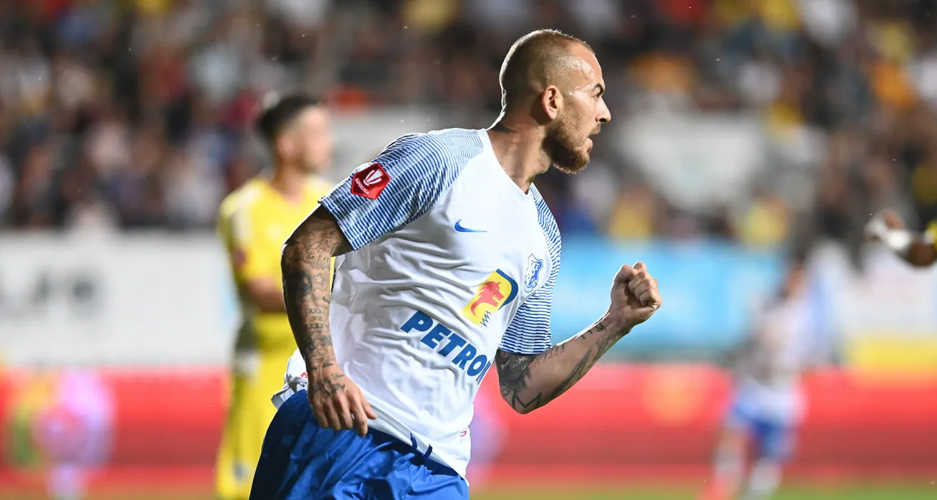 Denis Alibec se bucura dupa un gol marcat in meciul de fotbal dintre Petrolul Ploiesti si Farul Constanta, contand pentru Superliga Superbet, desfasurat pe Stadionul Ilie Oana din Ploiesti, vineri 16 septembrie 2022. © FOTO:Razvan Pasarica/SPORT PICTURES