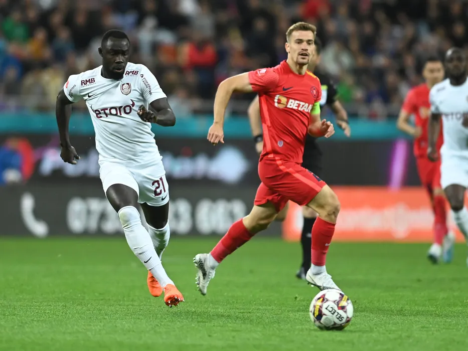 Bismark Adjei Boateng si Darius Dumitru Olaru in meciul de fotbal dintre FCSB si CFR Cluj, contand pentru Play-off-ul Superligii Superbet, desfasurat pe Arena Nationala din Bucuresti, duminica 14 mai 2023. © FOTO:Razvan Pasarica/SPORT PICTURES