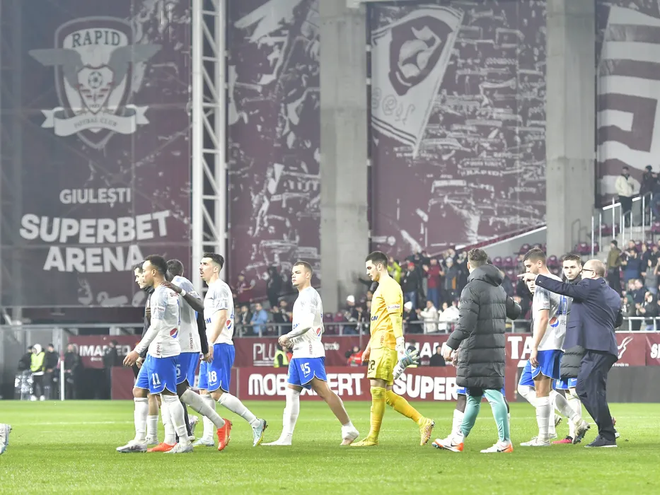 Fotbalistii constanteni Mateus Santos Barbosa, Andrei Viorel Artean, Gustavo Henrique Marins Silva si Marian Mihai Aioani parasesc terenul dupa meciul de fotbal dintre Rapid Bucuresti si Farul Constanta, contand pentru Play-off-ul Superligii Superbet, desfasurat pe Stadionul Rapid Giulesti din Bucuresti, sambata 1 aprilie 2023. © FOTO:Razvan Pasarica/SPORT PICTURES