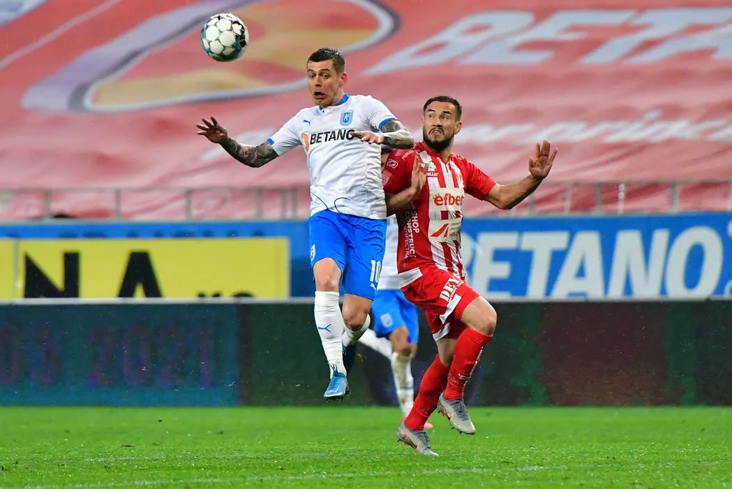 Alexandru Cicaldau (S), de la Universitatea Craiova, suteaza in timpul meciului de fotbal contra echipei UTA Arad din etapa a XXVII-a a Ligii 1, disputat pe stadionul Ion Oblemenco din Craiova, marti, 16 martie 2021. REMUS BADEA / MEDIAFAX FOTO