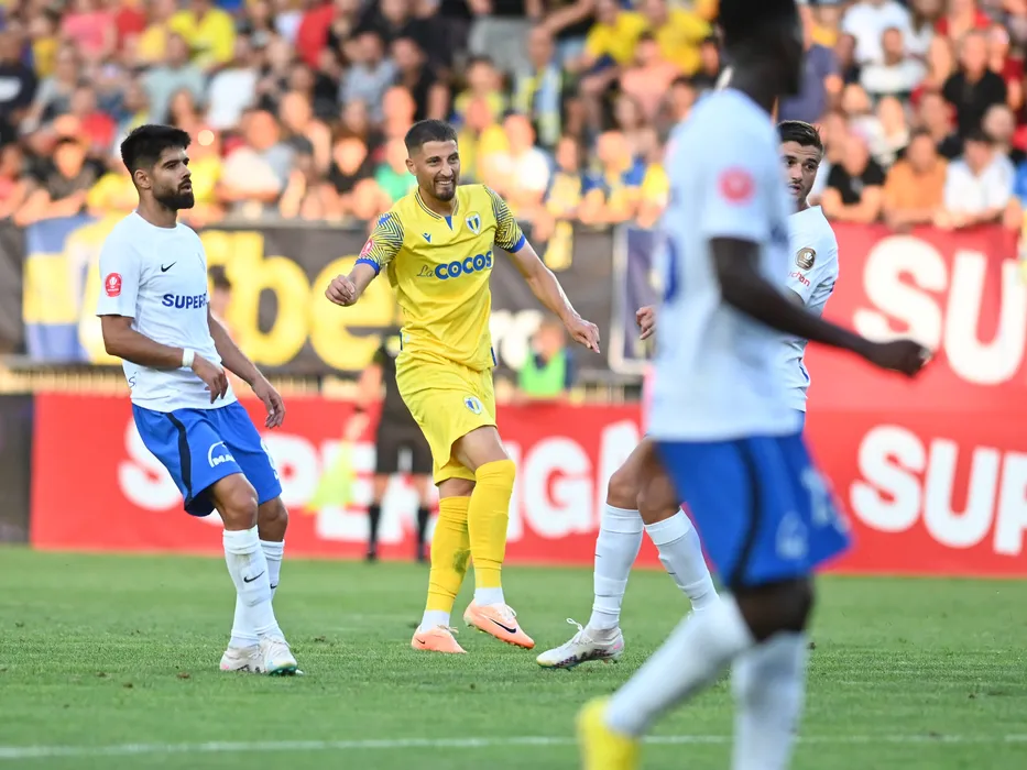 Gheorghe Teodor Grozav marcheaza un gol de langa Ionut Daniel Vina si Dragos Ionut Nedelcu in meciul de fotbal dintre Petrolul Ploiesti si Farul Constanta, din cadrul Superligii Superbet, desfasurat pe Stadionul Ilie Oana din Ploiesti, duminica 6 august 2023. © FOTO:Razvan Pasarica/SPORT PICTURES