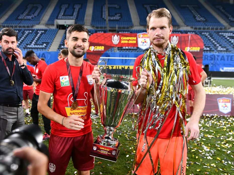 Mateo Susic si Giedrius Arlauskis pozeaza alaturi de trofeu dupa castigarea titlului de campioana in urma meciului de fotbal dintre Universitatea Craiova si CFR Cluj, contand pentru play-off-ul Ligii 1 Casa Pariurilor, disputat fara spectatori pe Stadionul Ion Oblemenco din Craiova, luni 3 august 2020. © FOTO:Razvan Pasarica/SPORT PICTURES