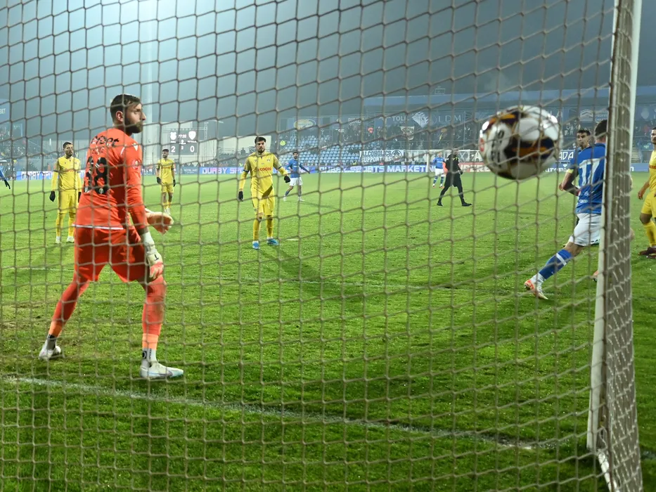 Ionut Justinian Larie marcheaza un gol in poarta lui Lukas Zima in meciul de fotbal dintre Farul Constanta si Petrolul Ploiesti, contand pentru Superliga Superbet, desfasurat pe Stadionul central al Academiei Gheorghe Hagi din Ovidiu, duminica 10 decembrie 2023. © FOTO:Razvan Pasarica/SPORT PICTURES