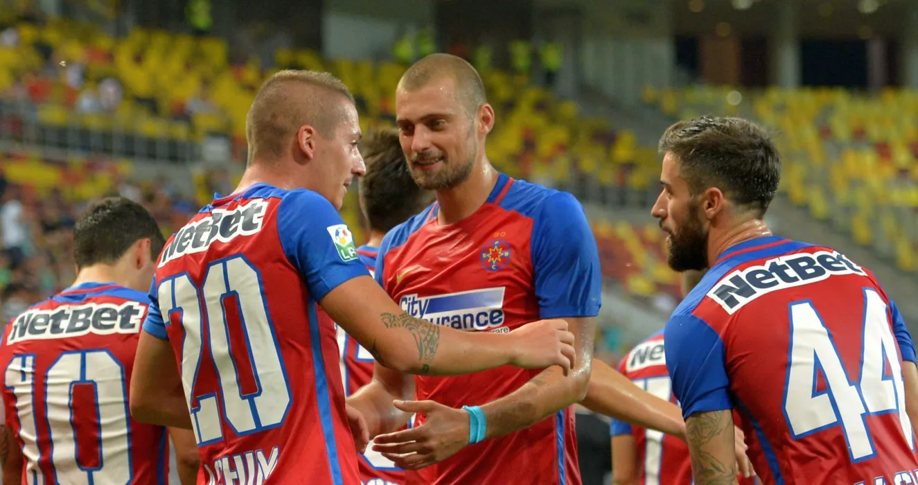 Gabriel Tamas si Gabriel Enache il felicita pe Vlad Achim dupa golul marcat