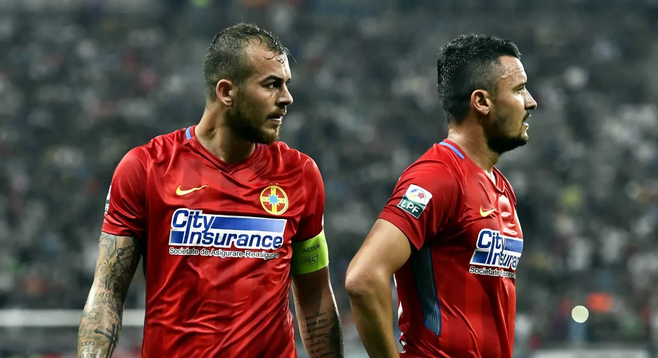Denis Alibec si Constantin Budescu in meciul de fotbal dintre FCSB si FK Viktoria Plzen,din turul 3 preliminar al Ligii Campionilor, desfasurat marti 25 iulie 2017 pe Arena Nationala din Bucuresti.Razvan Pasarica/SPORT PICTURES