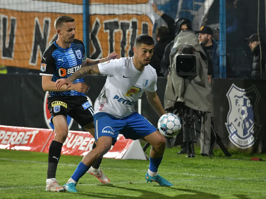 Nicusor Silviu Bancu si Jefte Betancor Sanchez in meciul de fotbal dintre Farul Constanta si Universitatea Craiova, contand pentru Play-off-ul Ligii 1 Casa Pariurilor, desfasurat pe Stadionul central al Academiei Gheorghe Hagi din Ovidiu, sambata 16 aprilie 2022. © FOTO:Razvan Pasarica/SPORT PICTURES