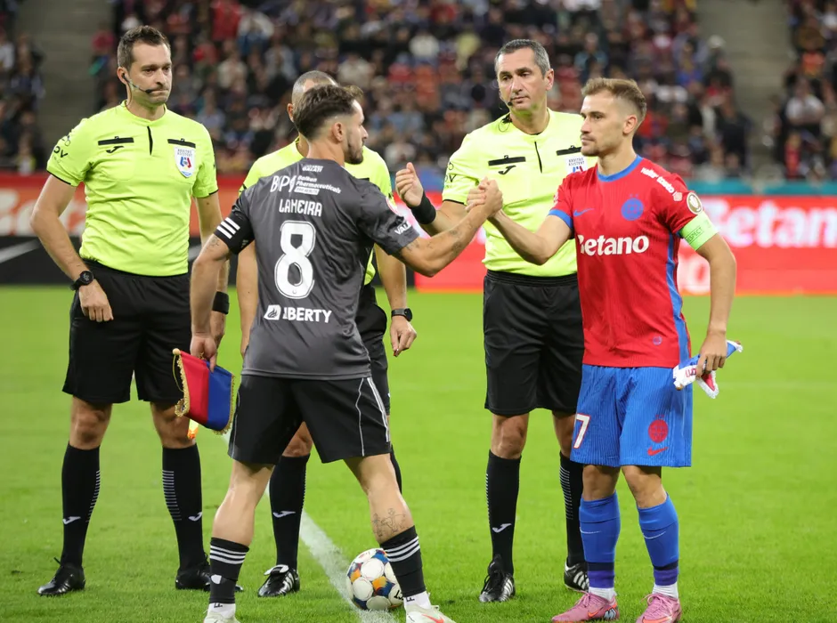 Brigada de arbitrii formată din Sebastian Eugen Gheorghe, Ionut Coza si Adrian Vornicu alături de căpitanii Darius Dumitru Olaru si Joao Pedro Santos Lameira la startul meciului dintre FCSB si Otelul Galati, contand pentru Superliga Superbet, desfasurat pe Arena Nationala din Bucuresti, duminica 28 septembrie 2025. © FOTO:Sorin Pana/SPORT PICTURES