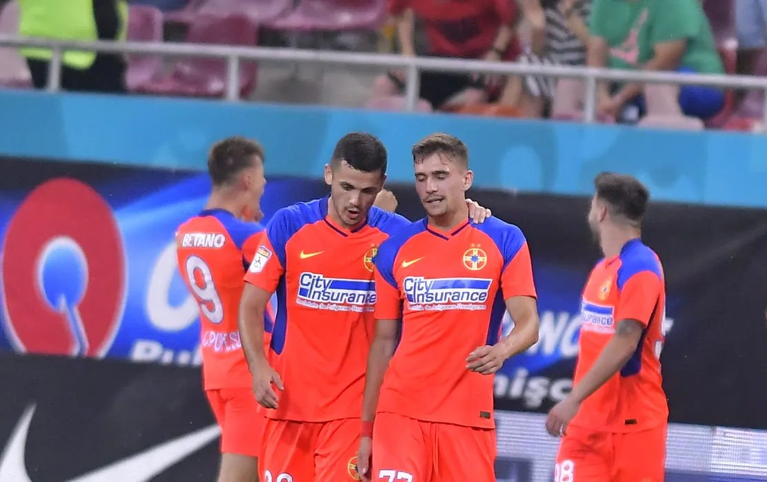 Ioan Dumiter discuta cu Sorin Danut Serban in meciul de fotbal dintre FCSB si Universitatea Craiova, contand pentru Liga 1 Casa Pariurilor, desfasurat pe Arena Nationala din Bucuresti, duminica 25 iulie 2021. © FOTO:Razvan Pasarica/SPORT PICTURES