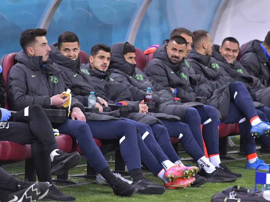 Banca de rezerve stelista cu Andrei Daniel Vlad, Ioan Andrei Vasile Dumiter, Valentin Gheorghe, Florinel Teodor Coman si Valentin Cretu la meciul de fotbal dintre FCSB si FC Voluntari, contand pentru Play-off-ul Ligii 1 Casa Pariurilor, desfasurat pe Arena Nationala din Bucuresti, luni 11 aprilie 2022. © FOTO:Razvan Pasarica/SPORT PICTURES