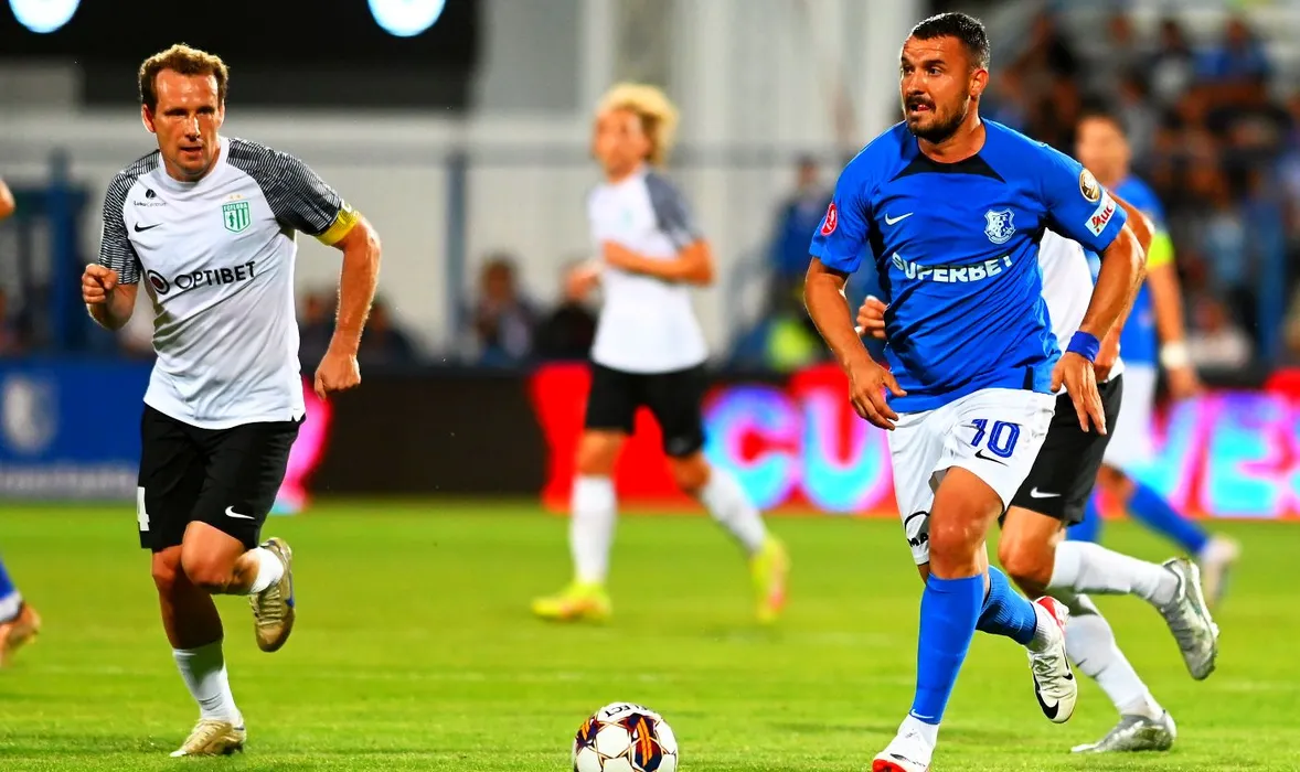 Konstantin Vassiljev si Constantin Valentin Budescu in meciul de fotbal dintre Farul Constanta si Flora Tallinn, contand pentru UEFA Europa Conference League, desfasurat pe Stadionul central al Academiei Gheorghe Hagi din Ovidiu, joi 10 august 2023. © FOTO:Razvan Pasarica/SPORT PICTURES