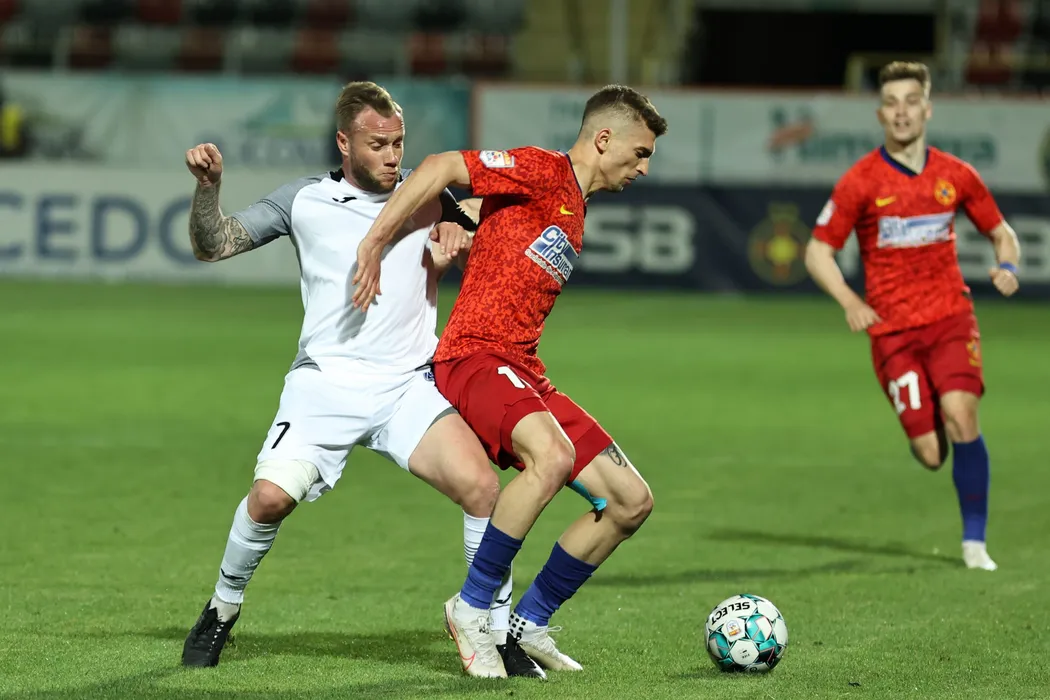 Florin Tanase (D), de la FCSB, lupta pentru balon cu Thibault Moulin (S), de la Academica Clinceni, in meciul de fotbal din etapa 7 a play-off-ului Ligii 1, disputat pe stadionul Marin Anastasovici din Giurgiu, luni, 10 mai 2021. GEORGE FILIP / MEDIAFAX FOTO