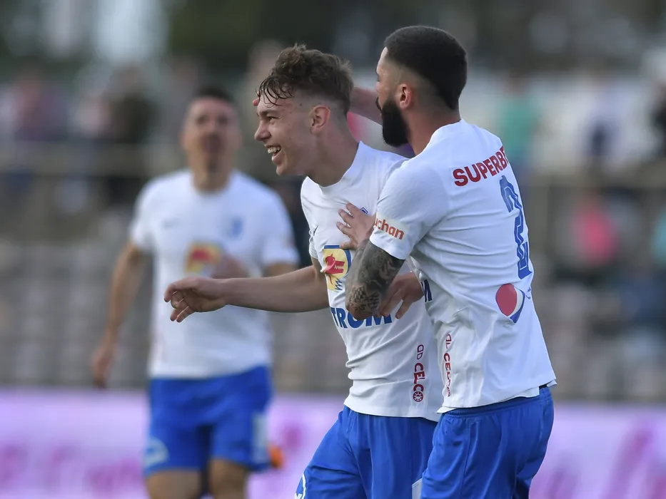 Bucurie a fotbalistilor constanteni dupa un gol marcat cu Eduard Gabriel Radaslavescu si Radu Stefanita Boboc in meciul de fotbal dintre FC Arges si Farul Constanta, contand pentru Play-off-ul Ligii 1 Casa Pariurilor, desfasurat pe Stadionul Nicolae Dobrin din Pitesti, sambata 9 aprilie 2022. © FOTO:Razvan Pasarica/SPORT PICTURES