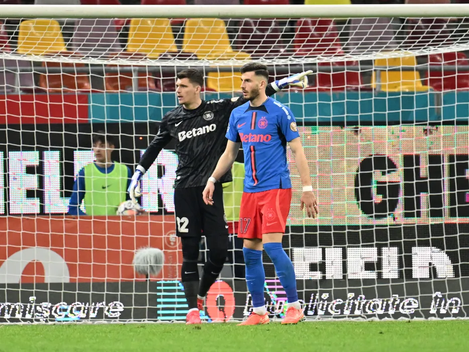 Fotbaliștii ros-albastrii Ștefan Târnovanu si Mihai Popescu in meciul dintre FCSB si Universitatea Cluj, contand pentru Play off-ul Superligii Superbet, desfasurat pe Arena Nationala din Bucuresti, sambata 5 aprilie 2025. © FOTO:Razvan Pasarica/SPORT PICTURES